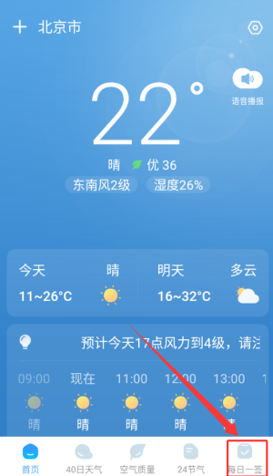 4、點擊底部菜單,瀏覽更多功能,如天氣預報、紫外線指數(shù)、空氣質(zhì)量等。